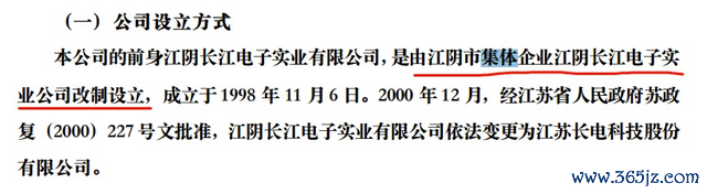 江阴长江电子实业公司的前身是江阴市晶体管厂,是1972年成立的专业生产半导体器件的原江阴县县属集体企业,在1992年5月更名为江阴长江电子实业公司,1993年1月作为江阴市内部职工持股股份试点企业,进行内部职工持股试点,1993年7月,改组为江阴长江电子实业总公司,注册资金1300万,其中公有资产为1000万,职工出资300万。