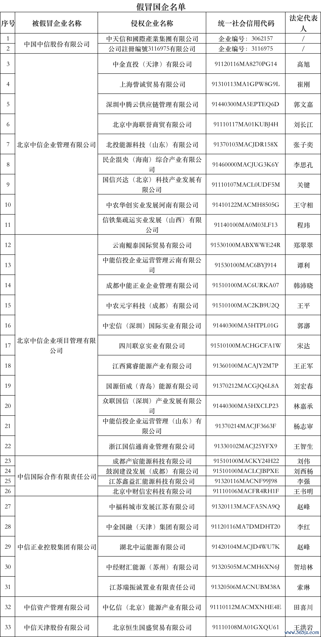 日前,中信集团监测到有不法分子通过伪造公章、签字等方式将中信集团下属中国中信股份有限公司、北京中信企业管理有限公司、中信天津股份有限公司、中信正业控股集团有限公司等子公司虚假登记为其股东,为保护投资者权益、维护公司声誉,中信集团现郑重声明如下: